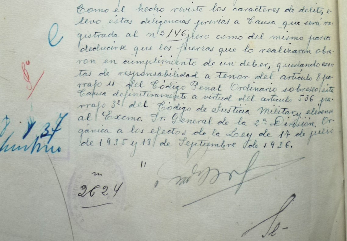 * La causa quedó sobreseída y sin responsabilidad, ya que se consideró que la actuación estaba comprendida en el bando de declaración de estado de guerra.