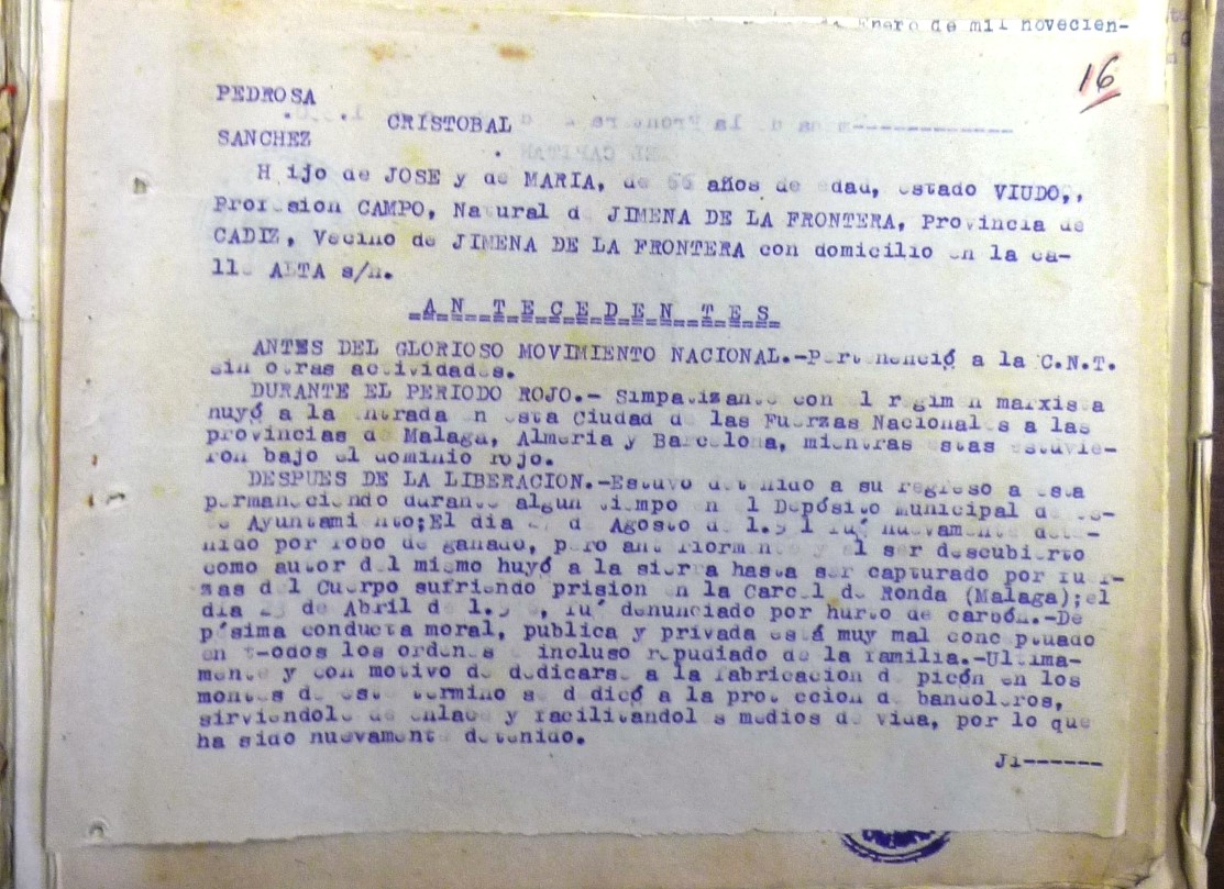 * Cristóbal Pedrosa Sánchez fue detenido el 25 de enero de 1950 acusado de auxiliar a guerrilleros del entorno.