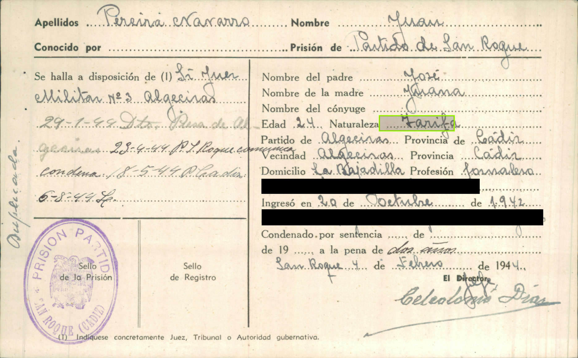 Pereira Navarro, Juan José. Fuente: Registro-Índice de la Población Reclusa (1938-1955). Archivo General de la Administración Pereira Navarro, Juan José. Fuente: Registro-Índice de la Población Reclusa (1938-1955). Archivo General de la AdministraciónDescargar