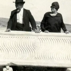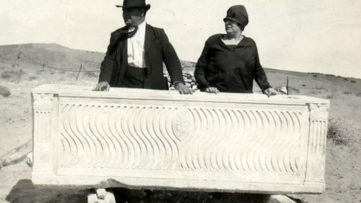 Evaristo Ramos Cadenas junto a su mujer Emilia Argüelles ante el sarcófago romano que descubrió en Carteia