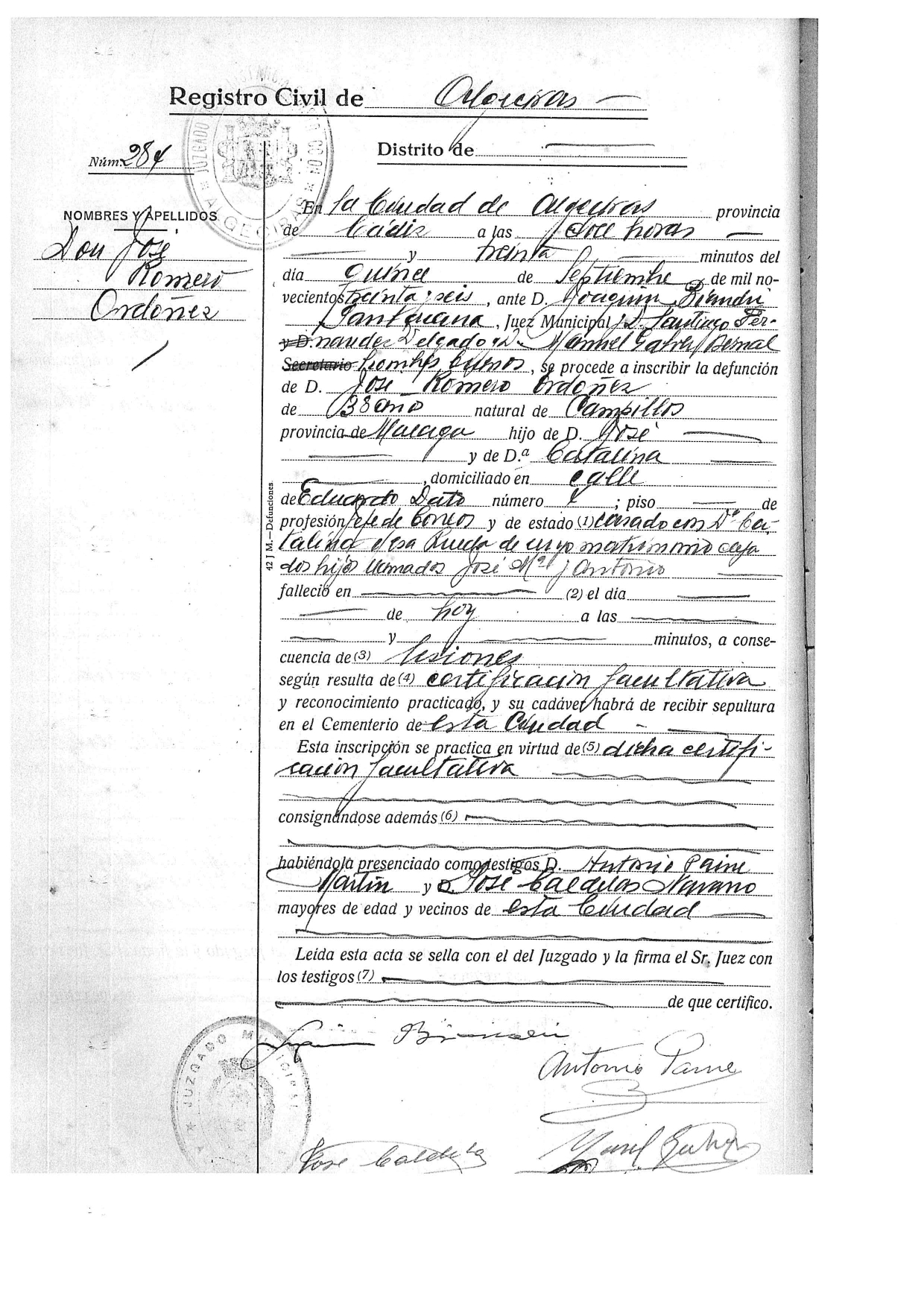 Inscripción de defunción de José Romero Ordóñez en el Registro Civil de Algeciras