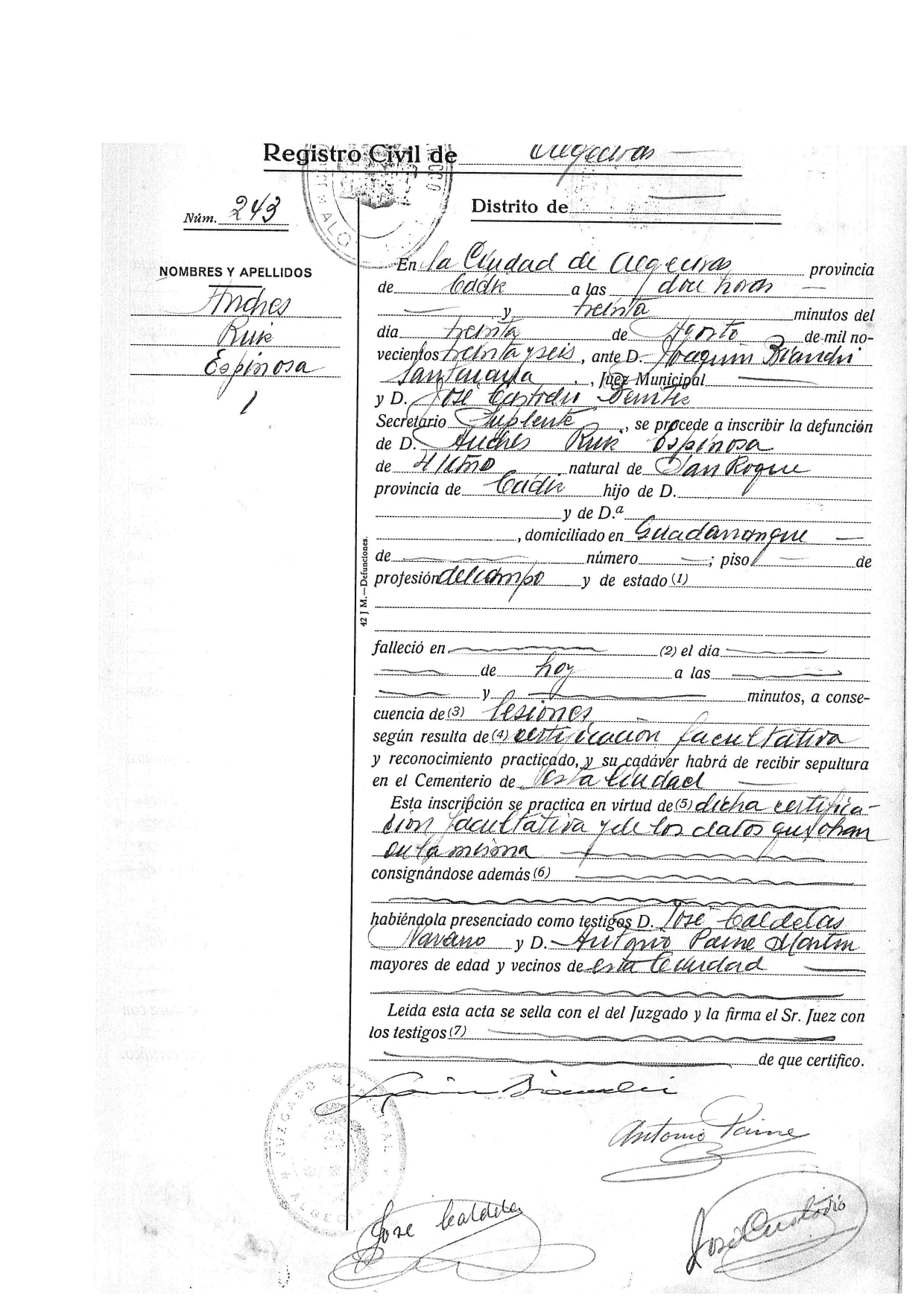 Inscripción de defunción de Andrés Ruiz Espinosa en el registro civil de Algeciras